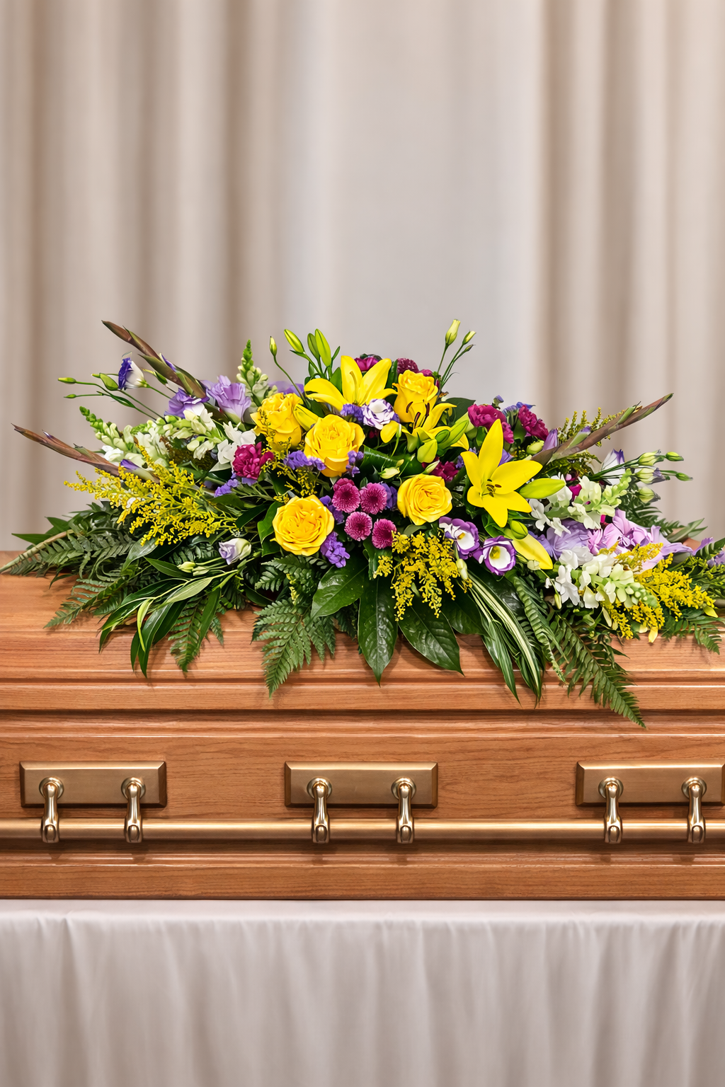 Presentation: Designed as a full casket spray, carefully shaped to drape beautifully across the casket lid for a refined and respectful presentation during services.