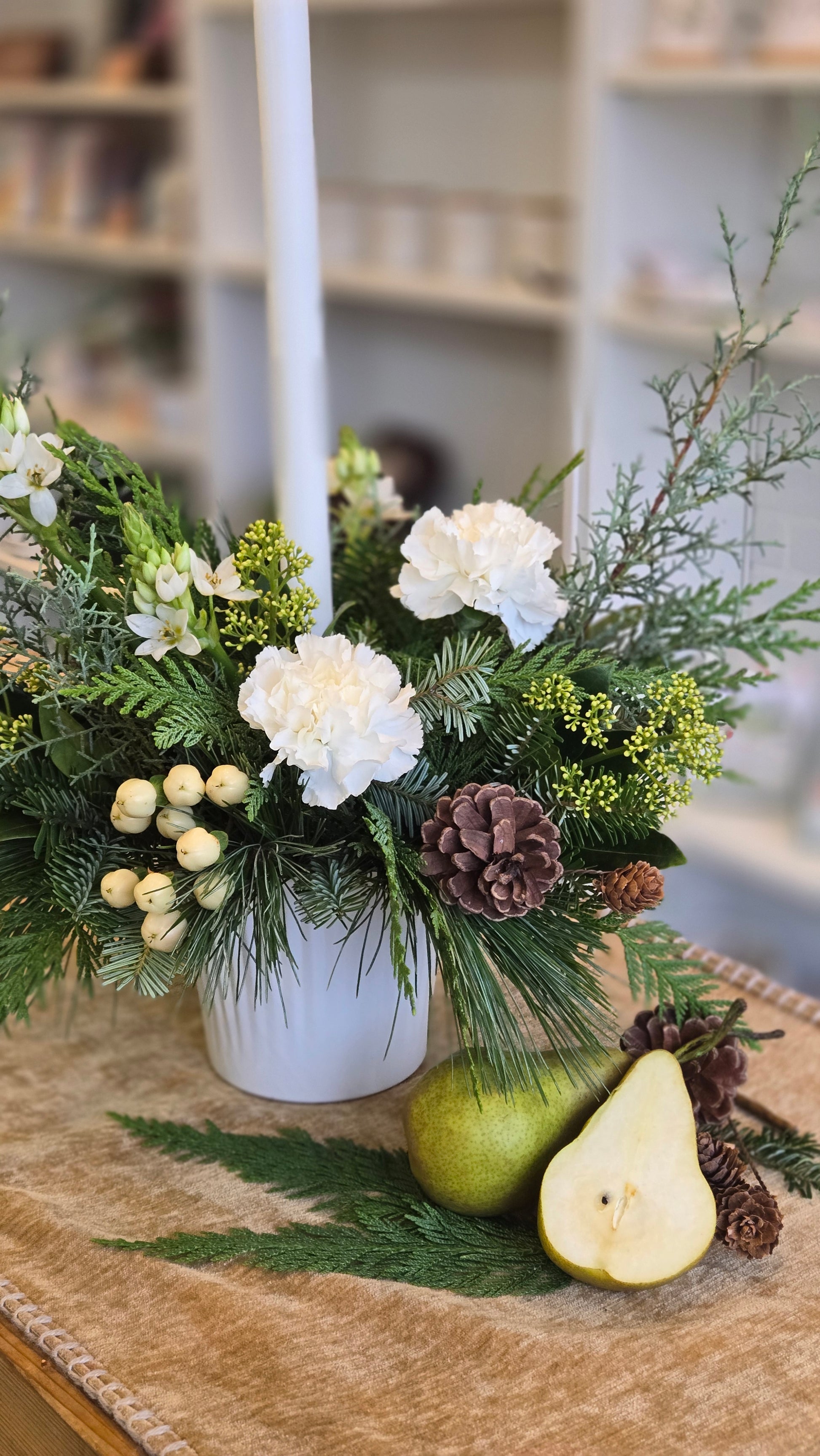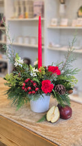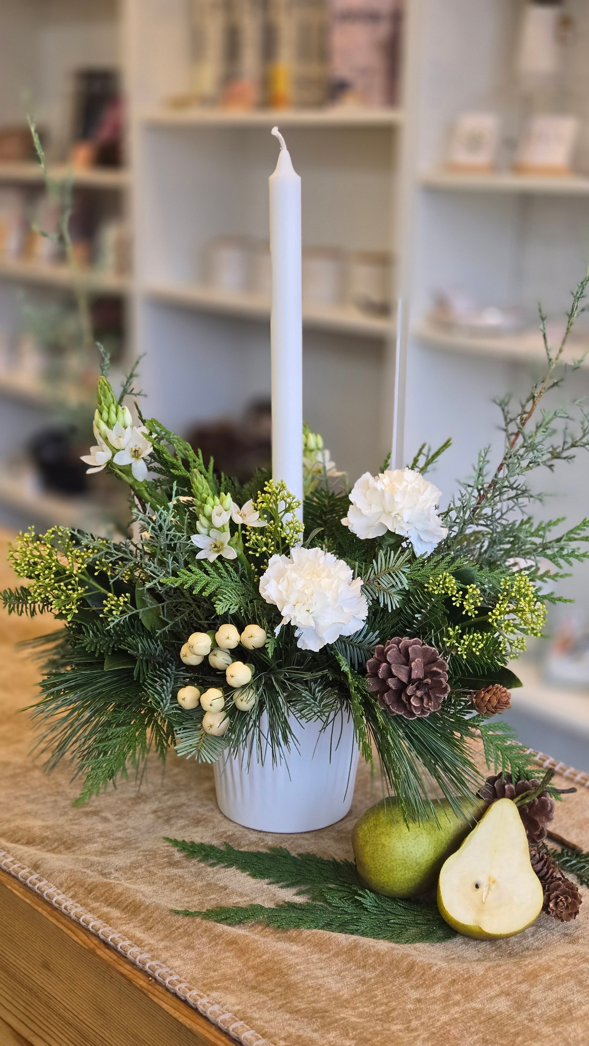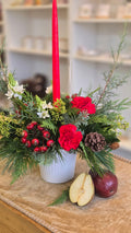 Timeless and festive, our Christmas Classic Arrangement brings the heart of the holidays to your home. Designed with vibrant blooms, evergreens, berries, and pinecones, this arrangement is centered around a glowing red or white taper candle — capturing the cozy charm of Christmas gatherings and candlelit dinners.