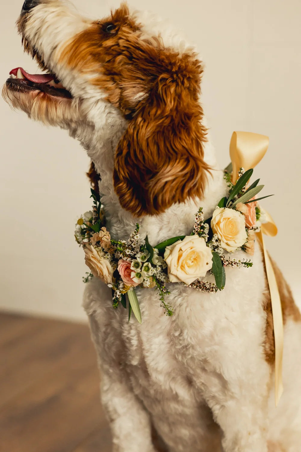 Dress your dog up with a beautiful floral collar. All collars are built with a ribbon closure.