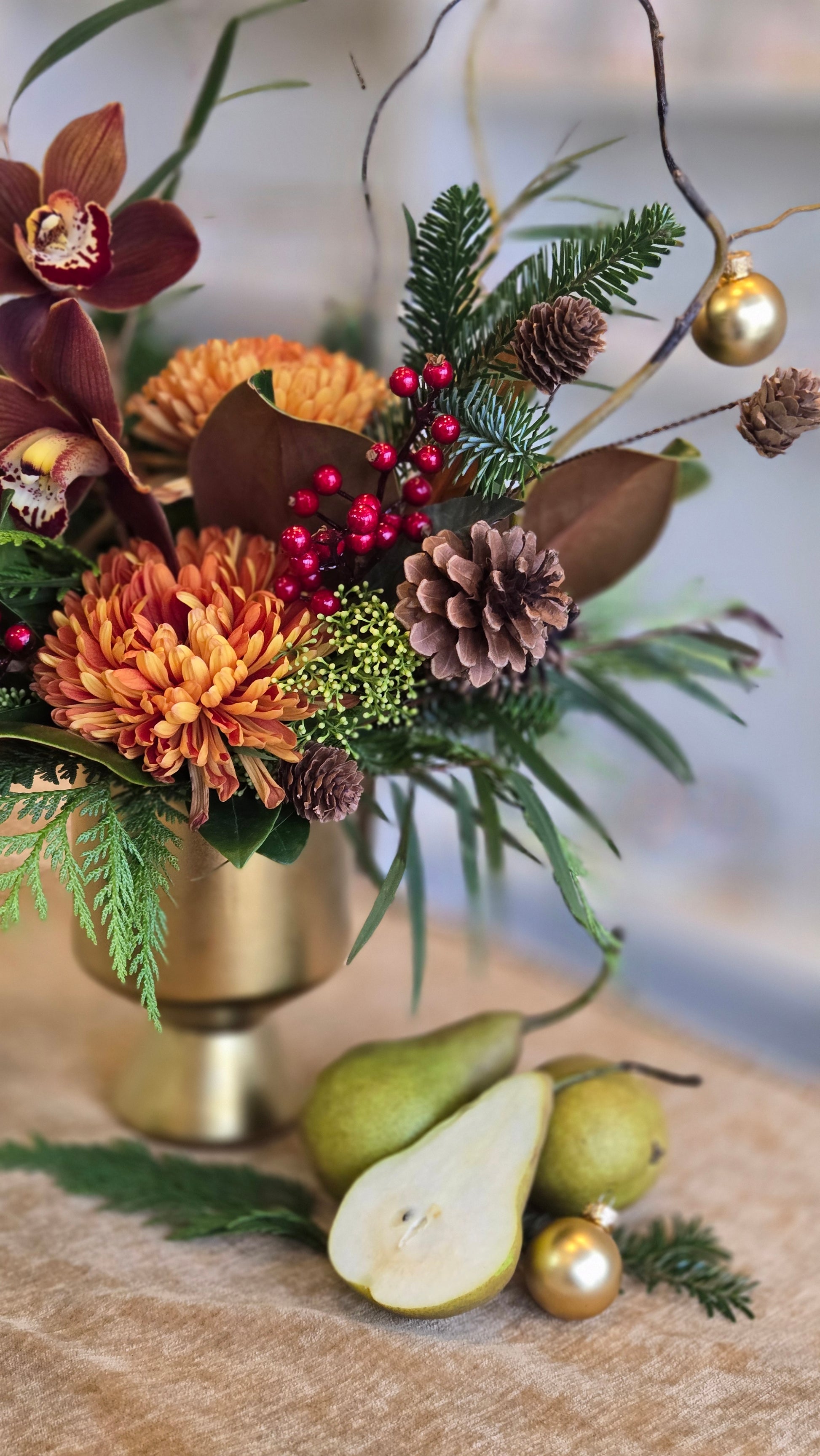 Celebrate the season’s natural beauty with our Golden Hearth Arrangement, a luxurious blend of rich color and organic texture. Designed in a matte gold pedestal vase, this piece features cymbidium orchids, chrysanthemums, cedar, fir, magnolia leaves, and pinecones, accented with berries and gold ornaments for a touch of holiday sparkle.