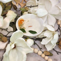 Soy candle in a beautiful white embossed bowl with natural decor.