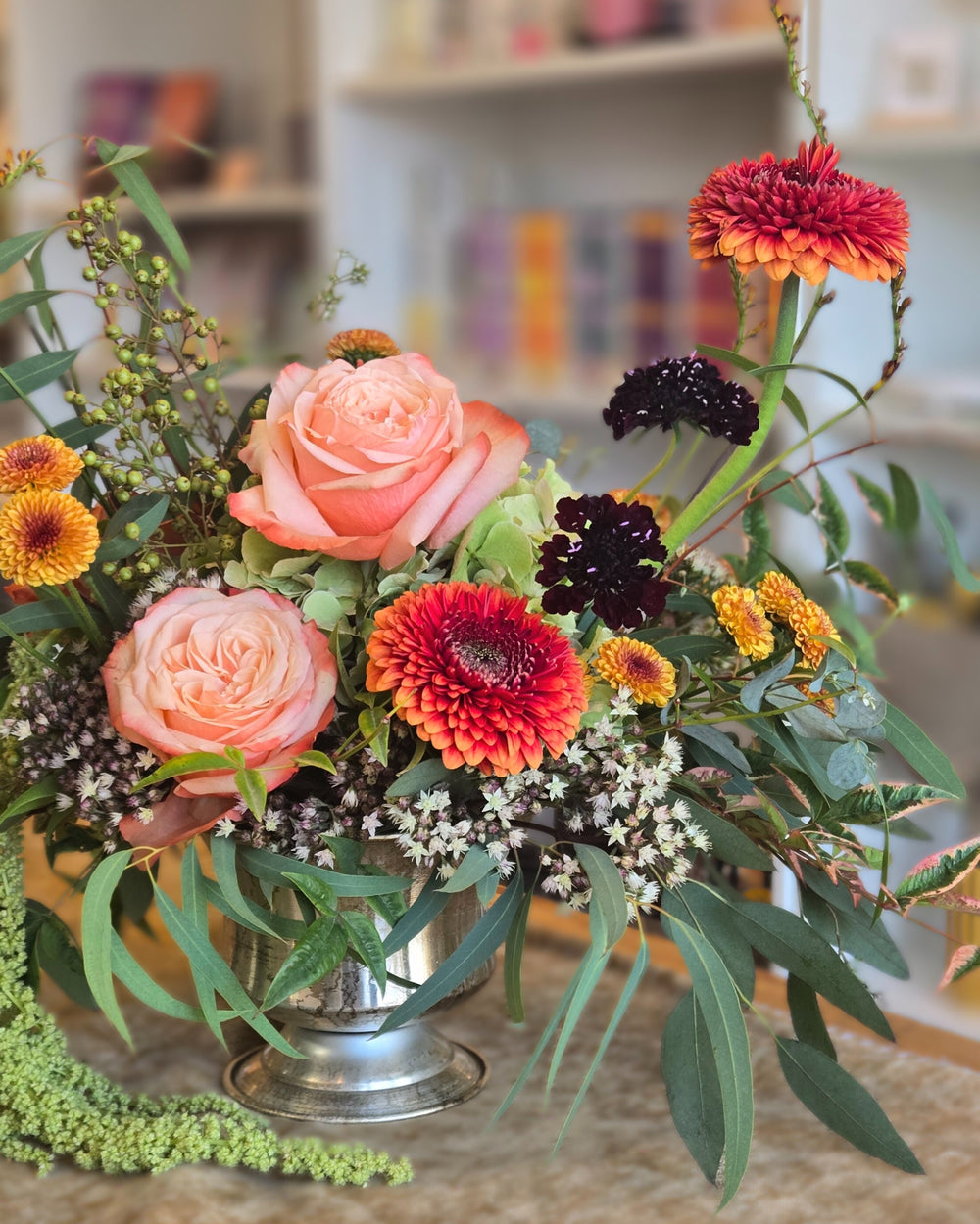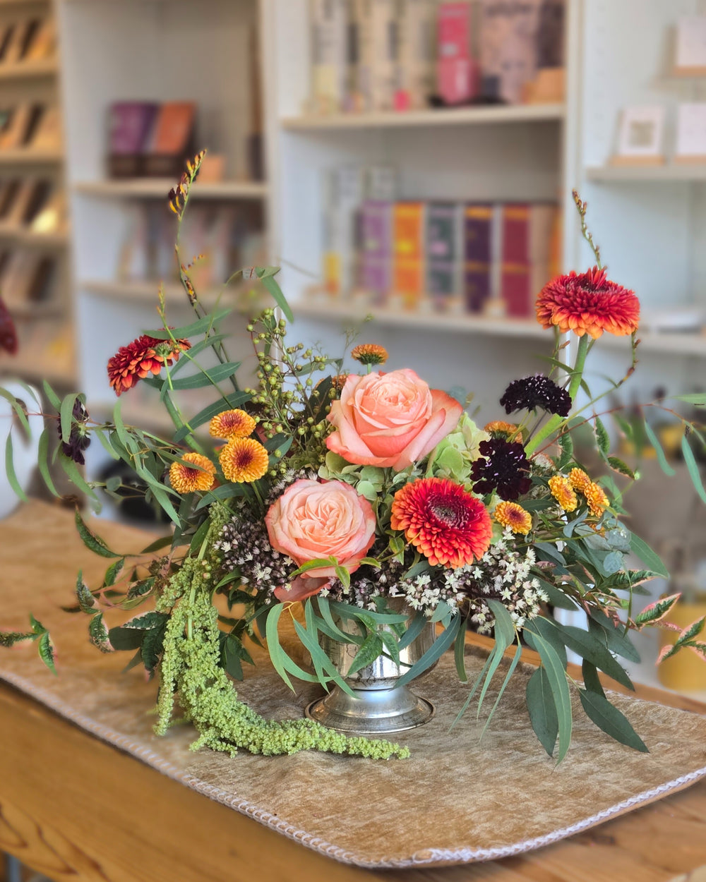 Our Harvest Glow arrangement captures the warmth of autumn with soft peach tones, fiery oranges, golden yellows, and rich burgundy accents. Designed in a timeless silver vessel, it brings rustic elegance and cozy sophistication to any table — perfect for gatherings, gratitude, or simply celebrating the season.