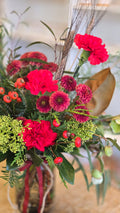 A joyful nod to the season’s timeless beauty, our Holiday Favorite Arrangement captures the spirit of Christmas with bright red blooms, festive berries, and lush winter greens. Designed in a rustic glass jar and tied with a plaid ribbon, this arrangement blends evergreen textures, pinecones, magnolia leaves, and cheerful seasonal accents for a naturally elegant look.