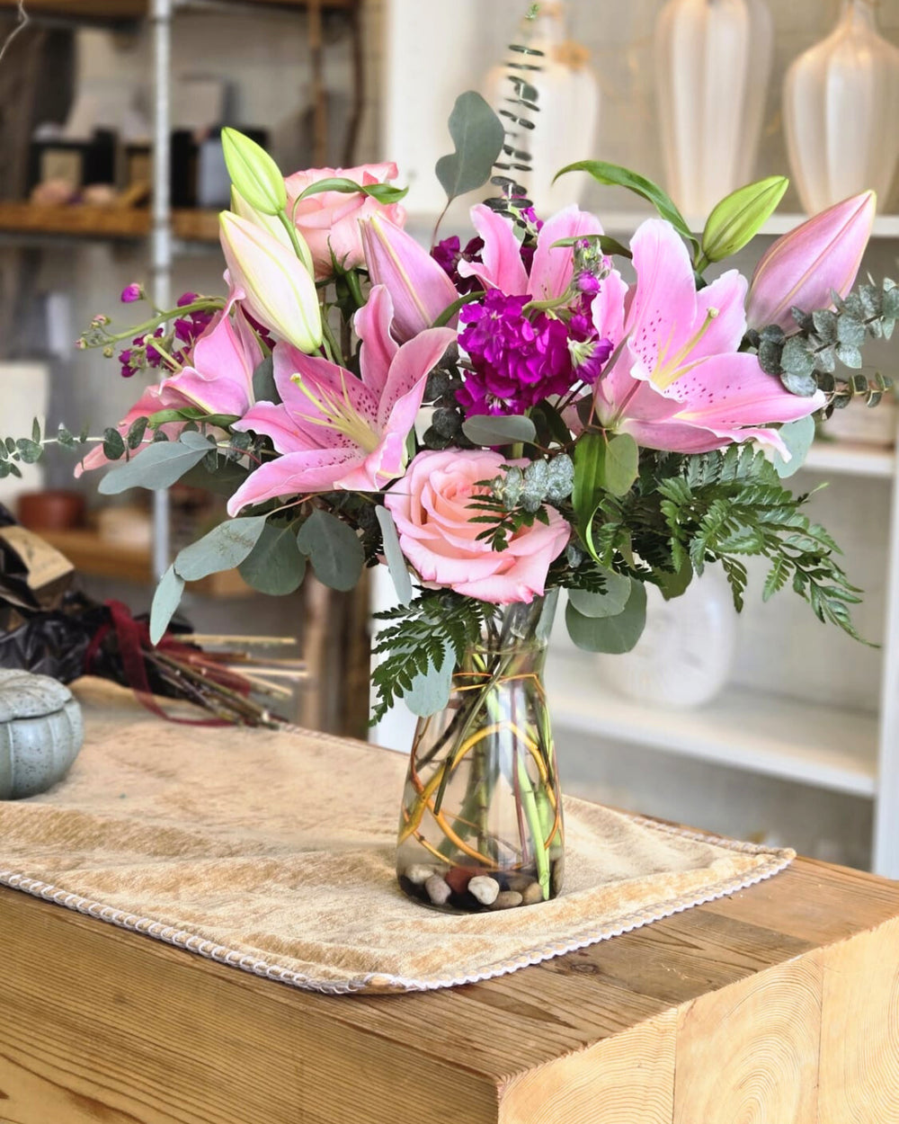 This stunning pink-forward arrangement captures the essence of romance with its delicate blend of fragrant pink lilies. Elegantly arranged in a clear glass vase, the soft hues of blush and rose create a perfect centerpiece for any occasion. Whether celebrating love, friendship, or a special moment, this bouquet brings timeless beauty and a touch of sweetness to any space.