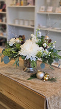 Understated elegance meets natural beauty in our Luxe Evergreen Arrangement — a sophisticated blend of winter whites, fresh greens, and subtle metallic accents. Designed in a silver-toned vessel, this piece features chrysanthemums, lisianthus, pinecones, and fragrant evergreens, accented with gold ornaments and frosted branches for a touch of holiday shimmer.