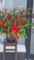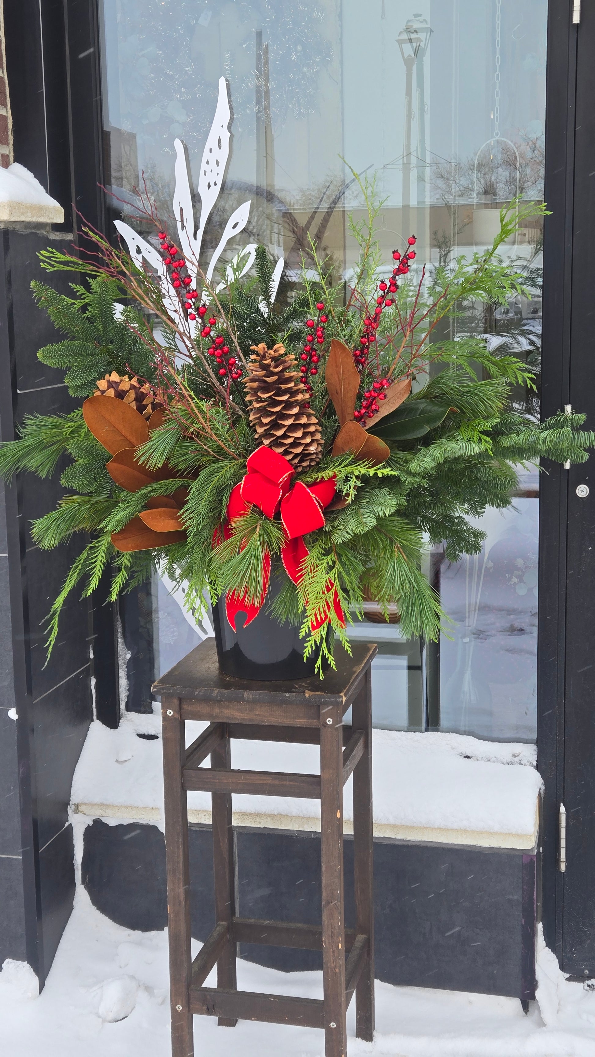 A beautiful assortment of fresh winter greenery, including assorted evergreens, alpine huck branches, ribbon, and festive ornaments, all finished with a beautiful bow. The planter will be made in a 10x10 round plastic insert—just place it in your decorative pot, and it will delight all winter long.