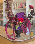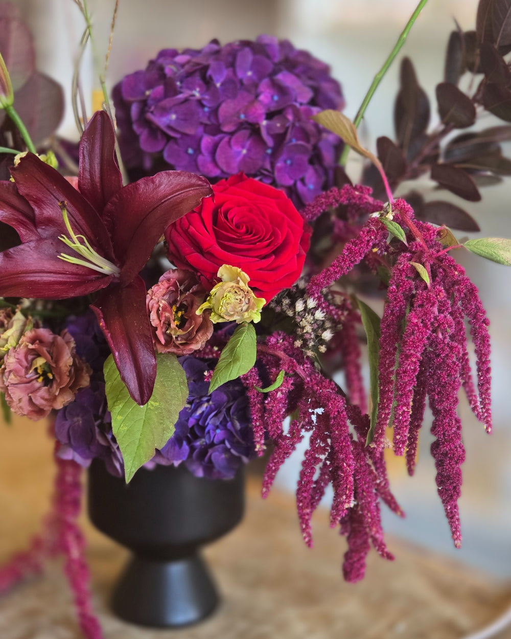 Rich, moody, and dramatic, our Velvet Twilight arrangement is designed to make a statement. This lush composition features velvety red roses, deep burgundy lilies, dusky lisianthus, trailing amaranthus, and bold violet hydrangea, accented with textural foliage and grasses for added movement and height.